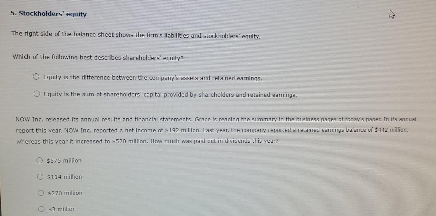 The initial claim on value of a companys assets before it pays off its liabilities. Equity is the sum of shareholders capital provided by shareholders and retained earnings. Which of the following best describes liabilities and stockholders equity.